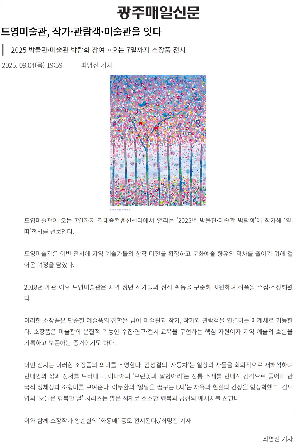 ![]() µå¿µ¹Ì¼ú°ü, ÀÛ°¡¡¤°ü¶÷°´¡¤¹Ì¼ú°üÀ» ÀÕ´Ù - ±¤ÁÖ¸ÅÀϽŹ® |