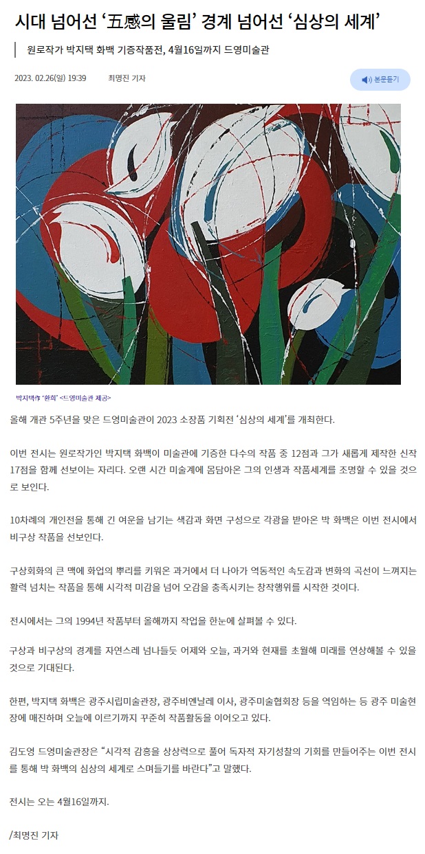 | ´ÙÀ½±Û | | ¹ÚÁöÅÃ È¹é ±âÁõÀÛǰÀü ¡®½É»óÀÇ ¼¼°è¡¯À» ¸¸³ª´Ù- ±¤ÁÖÀϺ¸ | °ü¸®ÀÚ |  2023/03/04 |