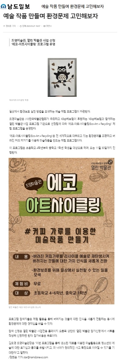 | ´ÙÀ½±Û | | µå¿µ¹Ì¼ú°ü ¹®È¿¹¼ú üÇèÇÁ·Î±×·¥ ¡®¾³-ÄÉÄ¡¡¯- ±¤ÁÖ¸ÅÀϽŹ® | °ü¸®ÀÚ |  2023/05/28 |