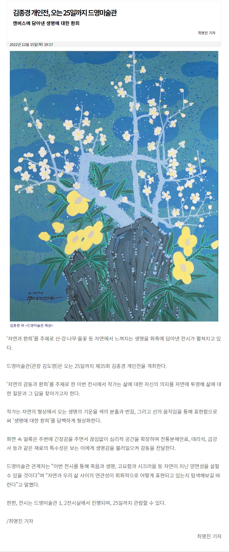 | Á¦ ¸ñ | ±èÁ¾°æ °³ÀÎÀü, ¿À´Â 25ÀϱîÁö µå¿µ¹Ì¼ú°ü- ±¤ÁÖ¸ÅÀϽŹ® | |||